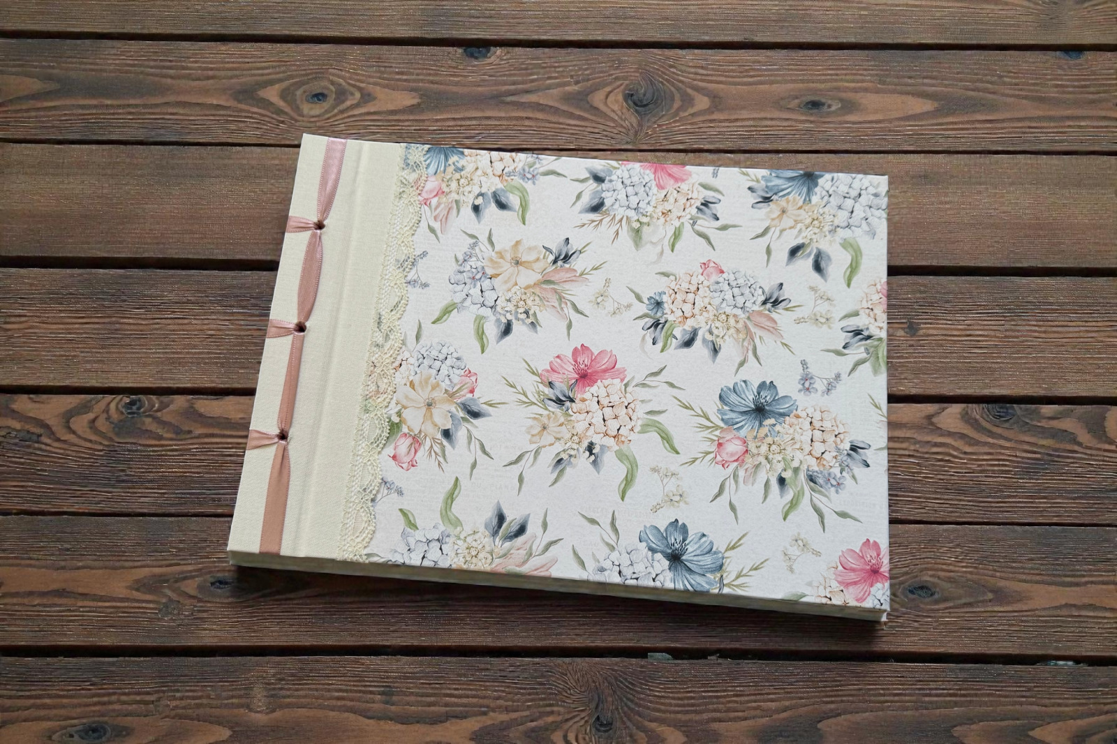 Uvnitř najdete 30 bílých listů + mezilisty. Doplněno starorůžovou stuhou.