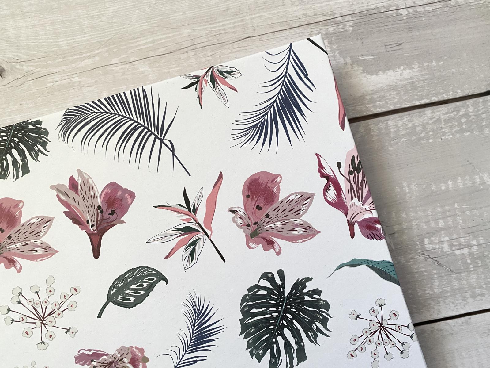 Desky potaženy růžovým knihařským plátnem a designovým papírem.
